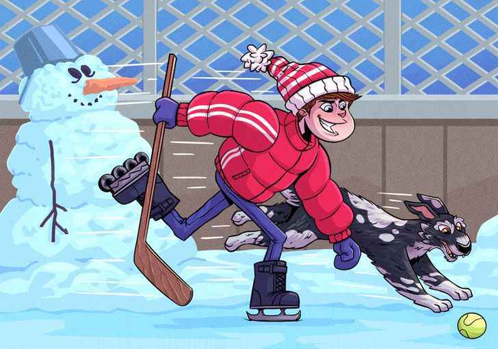 Na obrázku vidíme chlapce bruslícího na ledě a vedle chlapce běží pes. Na první pohled se může zdát, že na obrázku žádná chyba není, ale ve skutečnosti tomu tak není. Když se podíváte pozorněji, zjistíte, že některé věci byly nakresleny špatně.