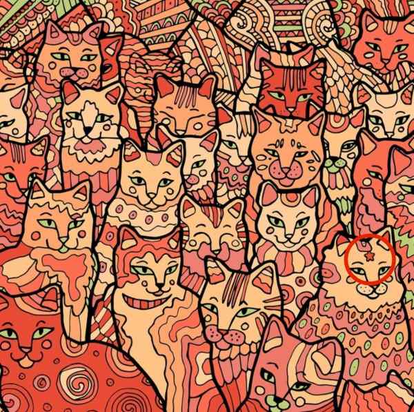 Na první pohled se může zdát, že na obrázku jsou jen kočky. Pokud se však podíváte pozorněji, zjistíte, že hvězda je skryta po celé scéně. Jste tedy připraveni ponořit se do tohoto obrázku a vyzvat svůj mozek, aby do 9 sekund našel hvězdu mezi kočkami?